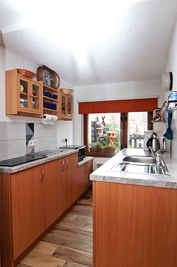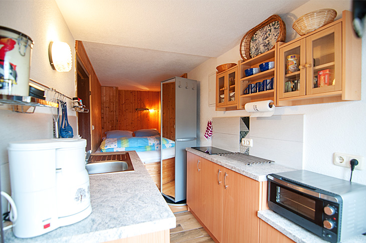 Küche und Schlafraum bilden gemeinsam ein längliches Zimmer mit Fenster hinaus auf die Terrasse.